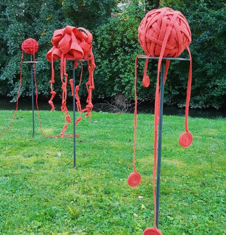 - Installation, Kleine Welten II, Filz, gewickelt, Durchmesser 25-70 cm, „Skulpturen am Weg“ / Steinhagen