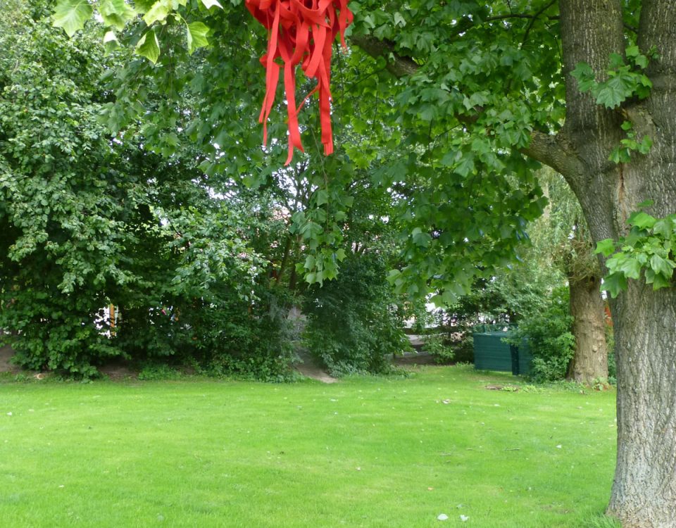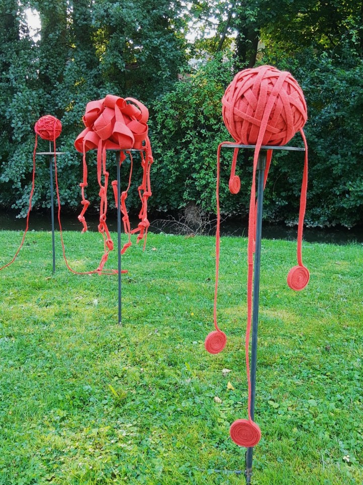 Das Skulpturenpfad–Event in Werther regte mich an, großformatige Arbeiten aus wetterfestem Filz zu entwerfen und herzustellen. Begonnen 2005 mit grauem Filz für eine große Installation aus Kleidsilhouetten, bei der ich ein Objekt rot bemalt hatte, verwende ich für weitere Arbeiten Filz in der Signalfarbe Rot. Die ab 2007 gestalteten Objekte / Installationen wirken in ihrer hellroten Erscheinung und Leuchtkraft kontrastreich zum Grün der Natur.